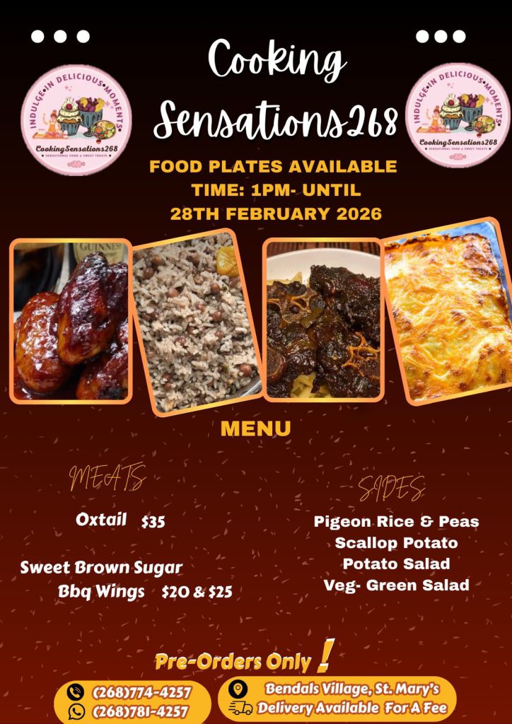 CookingSensations268, a small business whom invites you to indulge in delicious moments with a menu full of flavorful comfort food. Enjoy classics like: Sweet & Sour Chicken, BBQ Chicken, Garlic Parmesean and BBQ Fried Chicken, Pasta’s, BBQ Ribs, Escovitch Fish and more alongside hearty sides like: Rice & Peas, Mac pie, Shepherd’s pie, Cheesy Lasagna, Cheesy Loaded Potatoes and more. For a sweet and savory kick, try the sweet and spicy chicken—each dish crafted to take you on a bite into greatness!